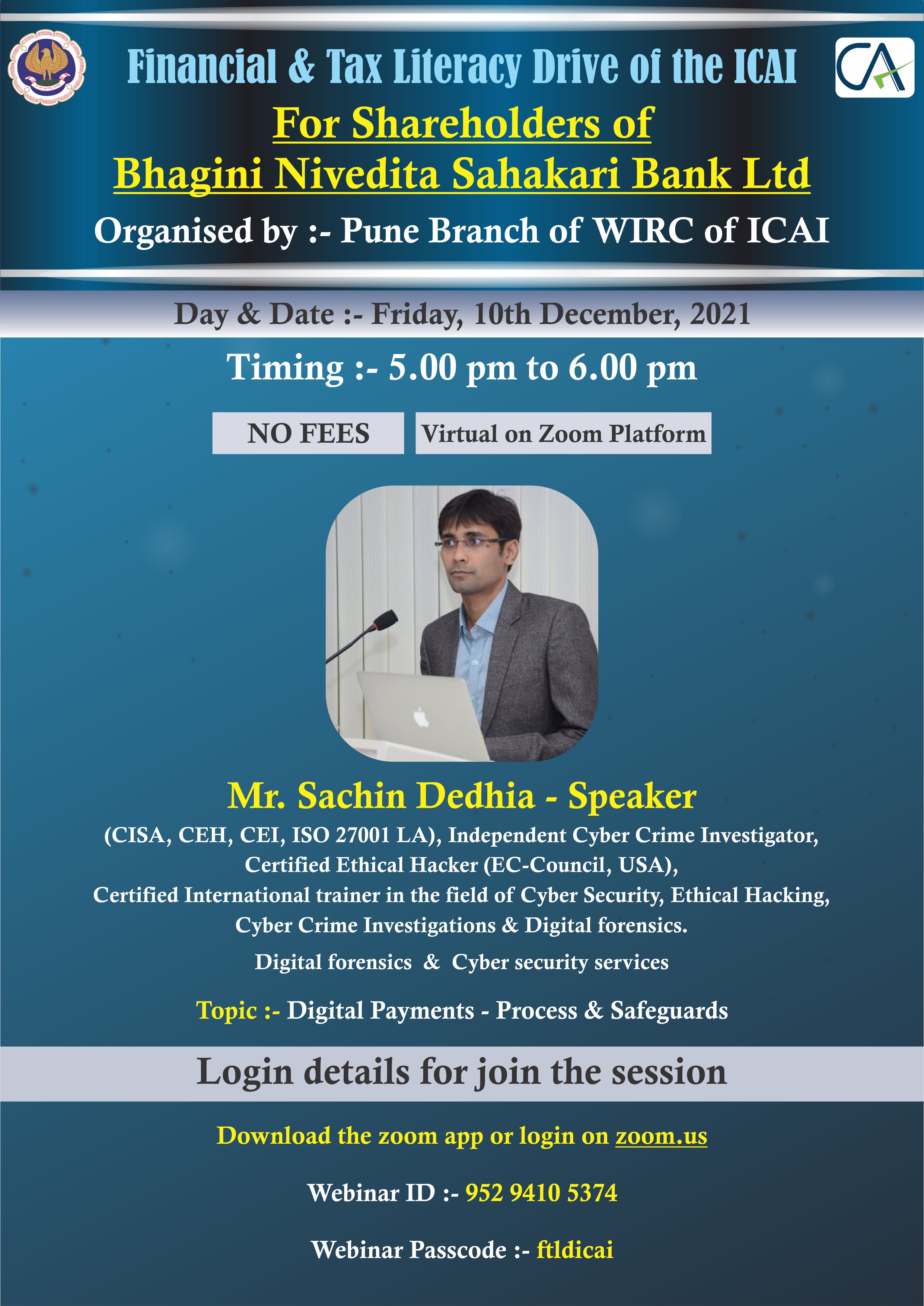 Financial & Tax Literacy Drive of the ICAI for Shareholders of Bhagini Nivedita Sahakari Bank Ltd.