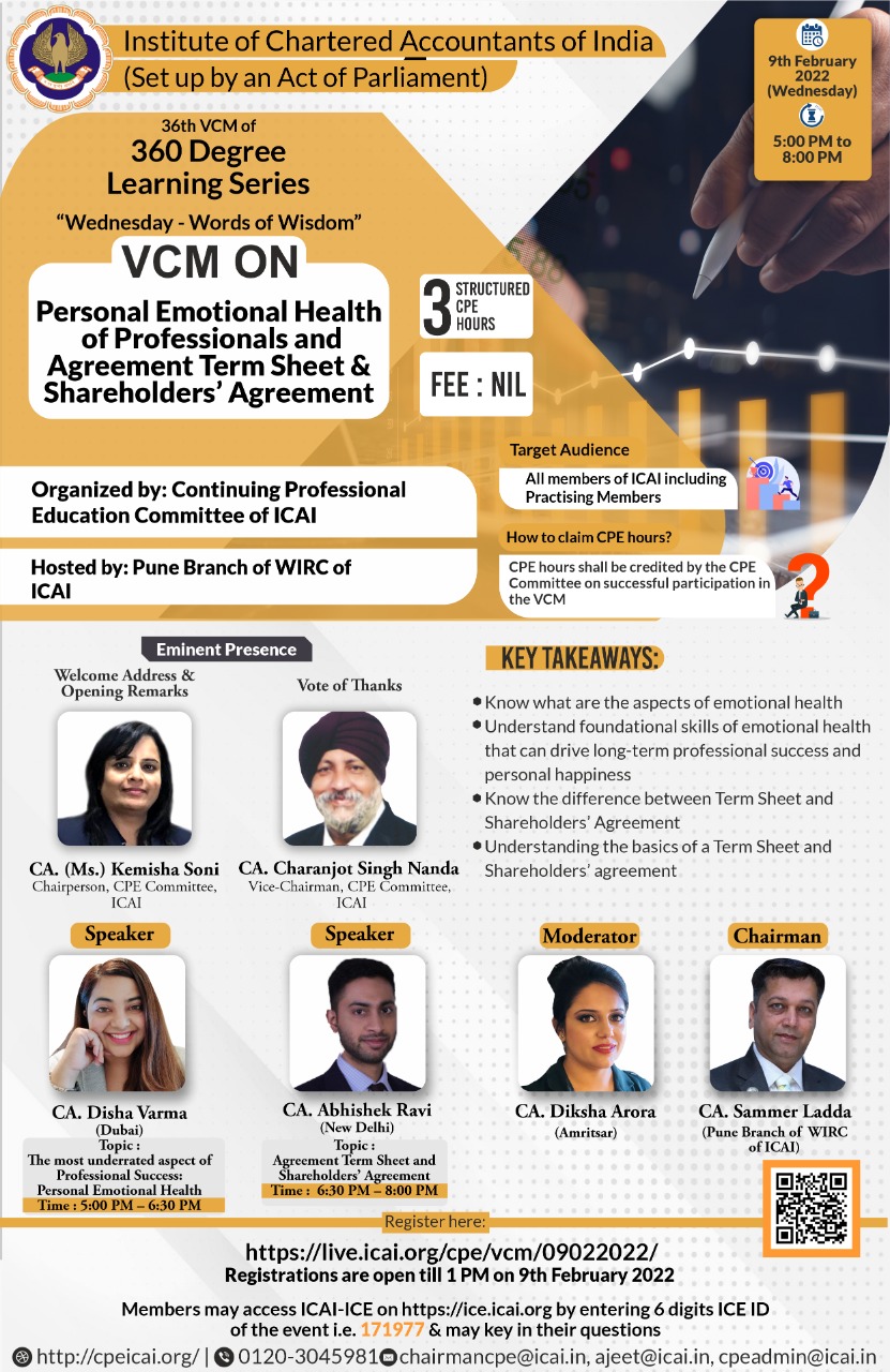 CPE Committee of the ICAI is coming up with the 36th VCM of the CPE Learning Series - "Wednesday - Words of Wisdom" on the topic "Personal Emotional Health of Professionals and Agreement Term Sheet & Shareholders’ Agreement" hosted by the Pune Branch of WIRC of ICAI.